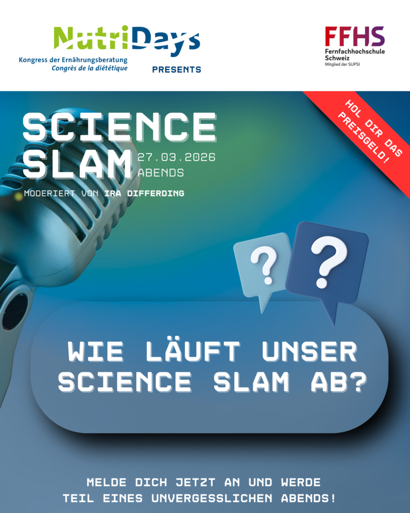 Hast du Lust deine Bachelorthesis, wissenschaftliche Arbeit oder z.B. einen Fallbericht aus der Praxis auf eine neue, lockere und unterhaltsame Art zu präsentieren? Dann mach mit beim Science Slam an den NutriDays 2026. Denn dieses Jahr wird die klassische Posterpräsentation zum ersten Mal durch den neuen Science Slam ersetzt.